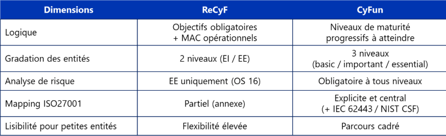 En suivant cette logique, le ReCyF s’inscrit dans un cadre réglementaire déjà dense et adopte une approche globalisante. Il laisse de la flexibilité aux organisations les plus matures, déjà soumises à d’autres réglementations, tout en offrant un cadre structurant aux acteurs moins avancés pour atteindre un socle de sécurité adapté à leur contexte. Il concilie ainsi différents niveaux de maturité sans alourdir inutilement les contraintes existantes.