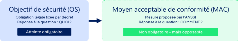 Le ReCyF repose sur une distinction structurante entre deux niveaux : les objectifs de sécurité, qui constituent les obligations légales fixées par décret et dont l'atteinte est obligatoire, et les moyens acceptables de conformité, qui sont les mesures que l'ANSSI propose pour atteindre ces objectifs, mais dont l'application n'est pas obligatoire en elle-même.